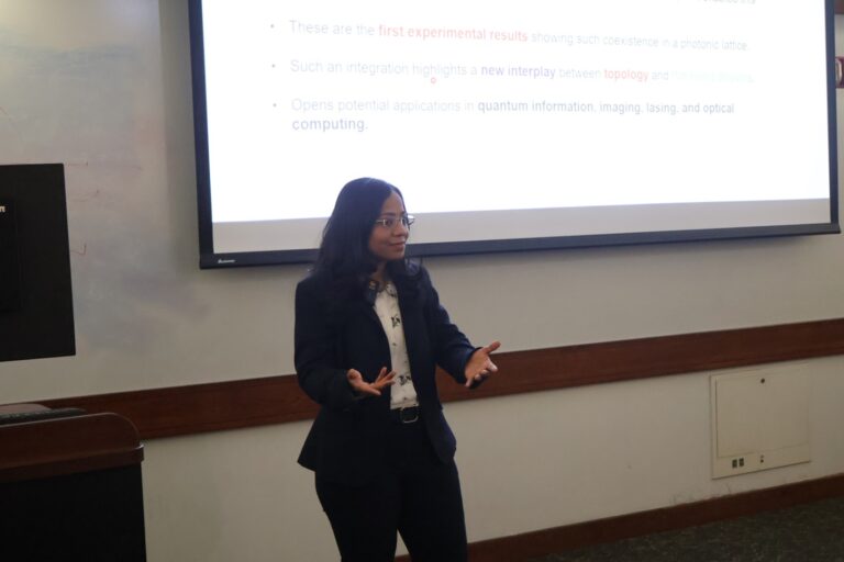 Following her presentation on “Observation of Topological Flat-Band States in Photonic Lattices”, Bhargava was announced as the winner of CREOL’s 2025-2026 Student of the Year Award.