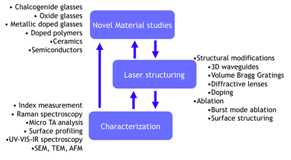 In addition the laboratory can access a number of different characterization facilities, provided and managed by either by LPL (i.e. multi-pump μRaman spectrometer), CREOL (i.e. ZYGO microscope) or UCF (i.e. AMPAC). The ongoing research within the LPT laboratory is listed as followed: