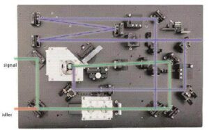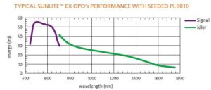 The OPO is a Continuum Sunlite EX, which uses BBO as the nonlinear crystal. There are also two BBO single-pass optical parametric amplifiers (OPA) that increase the output power. The OPO beam is spatially filtered both intracavity and externally to obtain a profile most resembling a Gaussian shape. The OPO signal beam is tunable from 450nm to 710nm, and its pulsewidth is 3-4ns (FWHM). The idler beam is then tunable from 710nm to 1682nm.