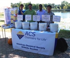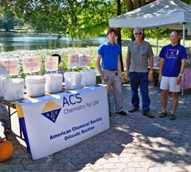 Research students in the Kuebler group joined the ACS Orlando Section in hosting a National Chemistry Week activities booth at the Maitland Farmers’ Market that showed visitors how chemistry is important and relevant to their everyday life. Young people learned about molecules in the air we breathe – including the good, the bad, and the ugly! – and made edible models of these molecules with pretzel sticks and colored marshmallows. Adults were invited to select “bags of atoms” that contained answers to intriguing questions from the world of chemistry, including: (1) Just how small is a molecule? (2) When salt is added to water, does the total volume increase or decrease, and why? (3) How important is chemistry to our economy?