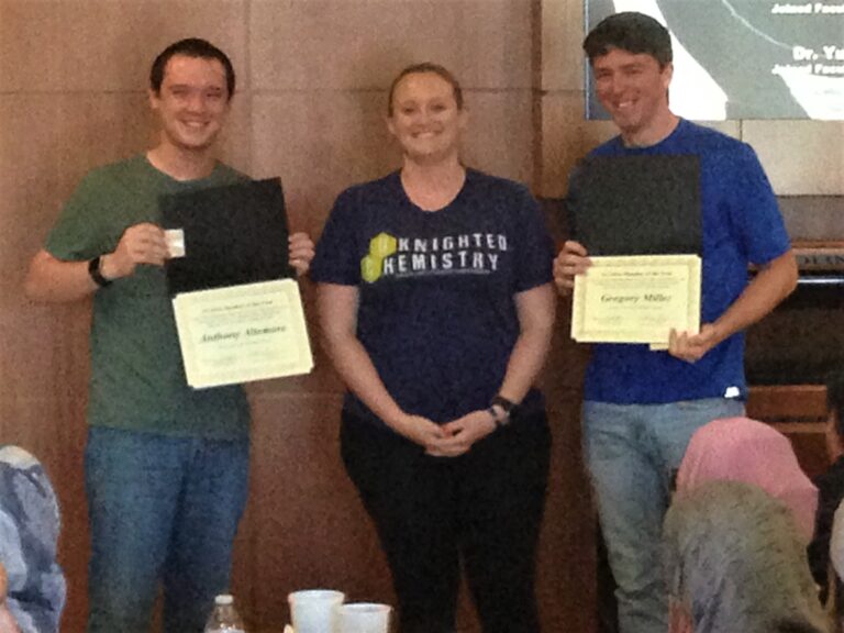 The Uknighted Chemistry Graduate Student Association (UCGSA) is a group comprised of Masters- and PhD-seeking Chemistry students that provides a student voice to the Chemistry department. Each year the executive board of UCGSA awards a Member of the Year Award to the member who has shown the most initiative and ambition that year. Gregory Miller (right) and Anthony Altomare (left, a student of Dr. Melanie Beazley) were awarded this honor by UCGSA President Katie McCormac (center, also a student of Dr. Beazley). Gregory and Anthony have both completed their first academic year of the graduate program and actively participated in the UCGSA activities throughout the 2016-2017 year. Greg was also elected as UCGSA’s Vice President for the coming year (2017-2018).