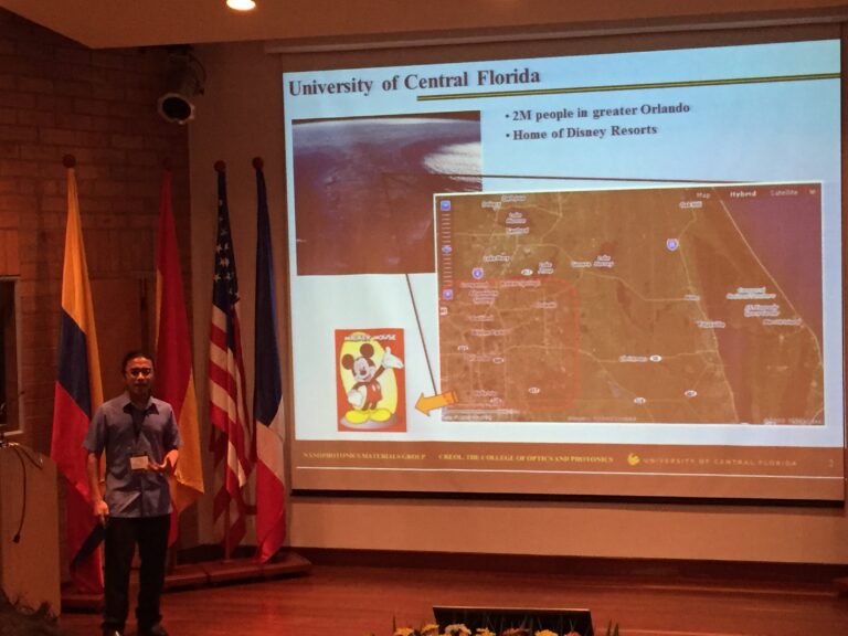 Jennefir’s research focuses on the tight control of light beams through spatially-variant photonic crystals (SVPCs). He showed that through multi-photon direct laser writing in the photo-polymer SU-8 he could fabricate three-dimensional SVPCs that were able to direct the flow of light around a 90 degree bend. Here, he is demonstrating to optics students and faculty from Columbia how Orlando can be both the “The Happiest Place On Earth” and one of the best places on earth for novel research in optics. Jennefir was also awarded the 2nd place oral presentation award.