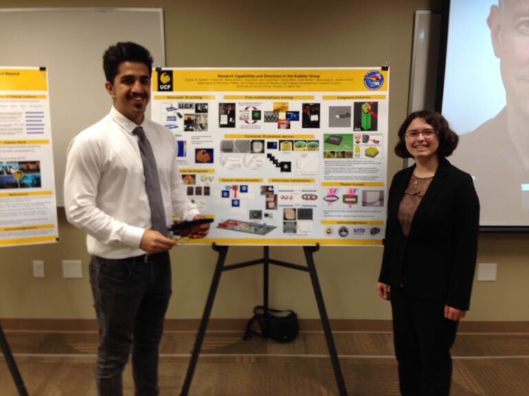 Chemistry PhD student Pooria Golvari and Optics undergraduate Hannah West described research going on in the Kuebler Group to visitors attending the UCF-Chemistry Open House event on Sunday 31 March 2019. Visitors included students, UCF alumni, and invited attendees of the ACS National Meeting in Orlando (31 Mar. – 4 April 2019). Well done, Pooria and Hannah!