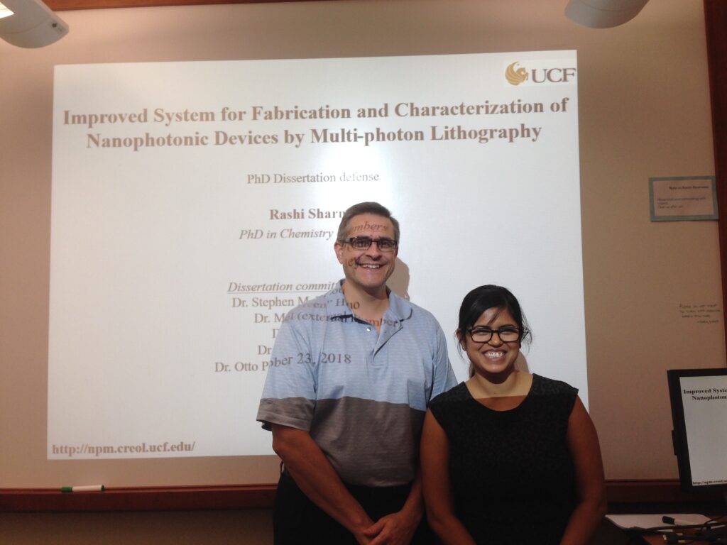 Chemistry PhD student Rashi Sharma successfully defended her dissertation entitled “Improved System for Fabrication and Characterization of Nanophotonics Devices by Multi-Photon Lithography.” Congratulations, Rashi!